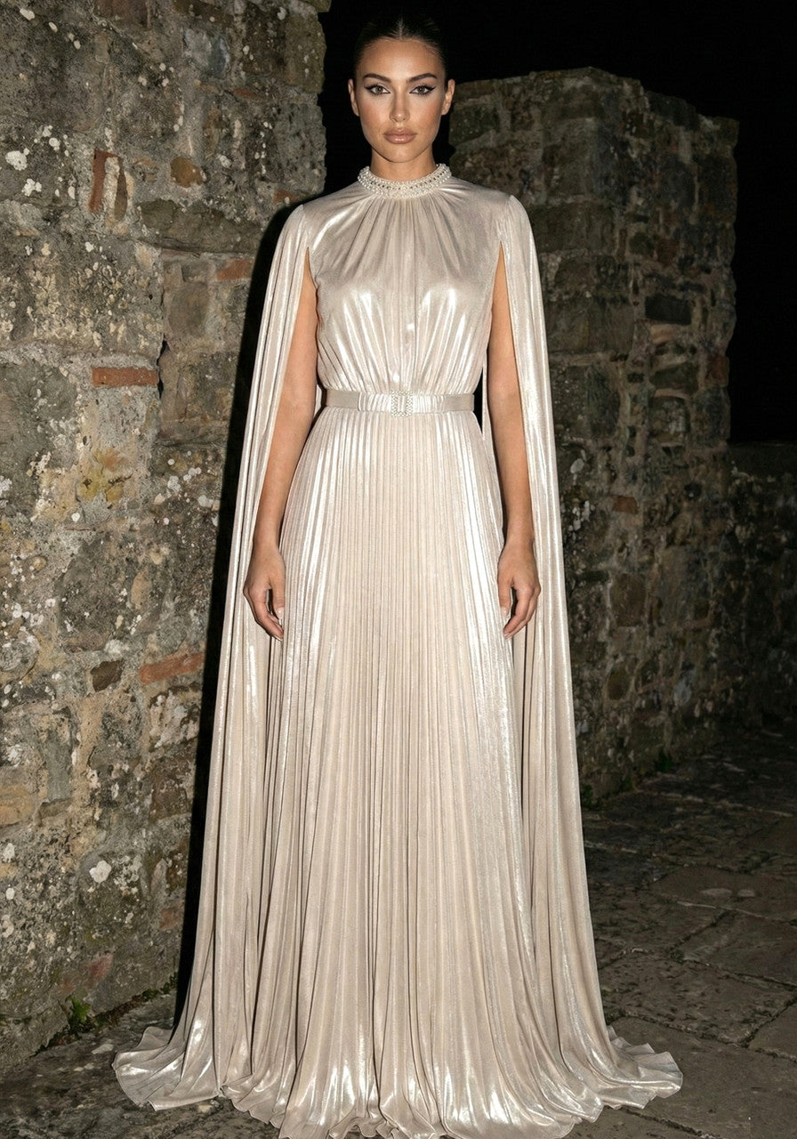Cape Sleeve Pleated Maxi Dress Champagne