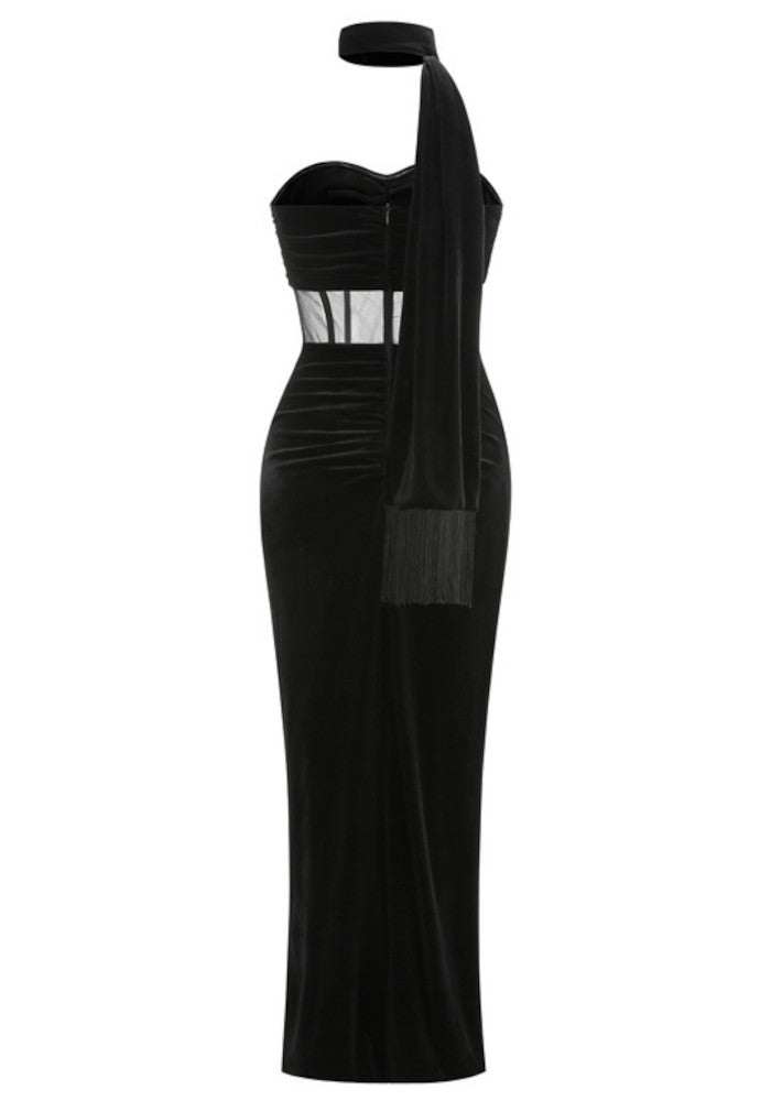 Strapless Mesh Insert Maxi Velvet Dress Black